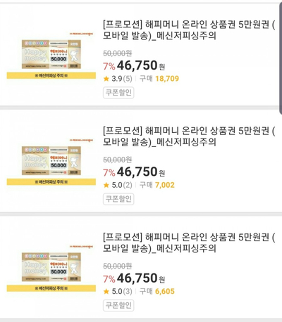 드디어 위메프 등에서 해피머니 상품권 5만원권이 등장했습니다.